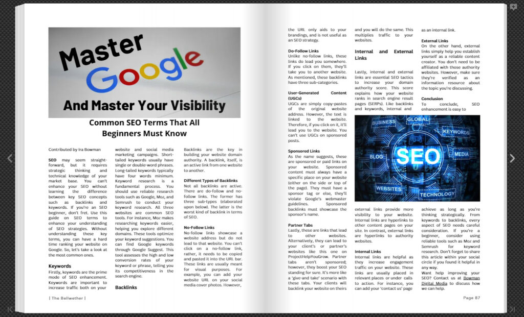 Over his 25-year career to date, Ira has spent most of his time in sales roles, from active contributor to department director. One thing that remained constant was that Ira always worked hard to help SMBs (small and medium businesses) increase their ROI and gain market share by providing analytic marketing analysis and strategic marketing advice. Since June 2020, with the launch of Ira’s business, Bowman Digital Media, Ira has focused on helping increase website traffic and increase visibility for his clients online. The internet has become the main source of commerce and visibility, more than any other marketing channel and therefore it is extremely important to increase sales.
